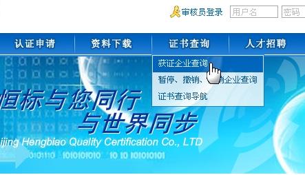 二、證書查詢方法 (一)通過恒標網(wǎng)站查詢 1、登陸www.rivercrosstracking.com,進入北京恒標質(zhì)量認證有限公司網(wǎng)站首頁;